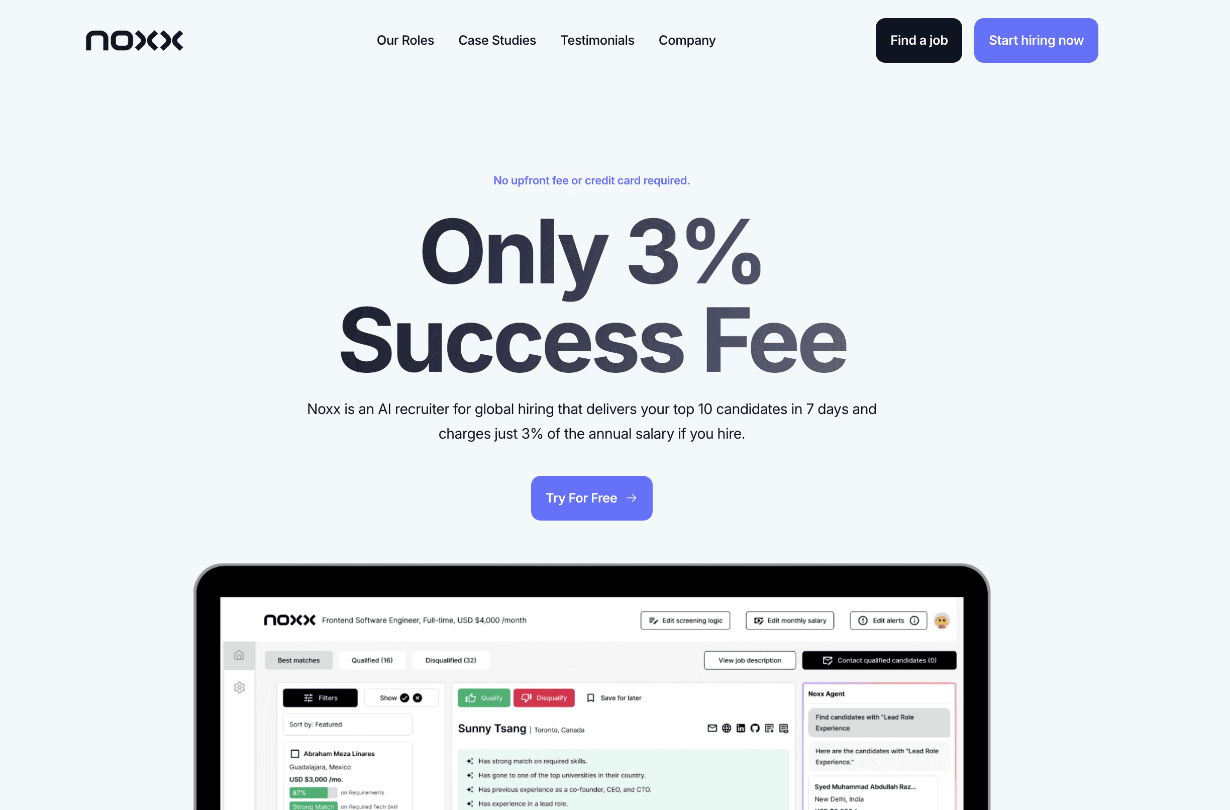 Finding the right talent shouldn't take months or cost a fortune. Noxx's AI recruiter finds you the top 10 candidates in just seven days by screening over 1,000 applicants automatically. You only pay 3% if you hire someone, with no upfront fees or expensive recruiter commissions.